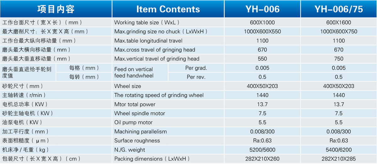 工作台纵向运动为液压驱动。磨头在拖板上的横向运动,YH-006由液压驱动(7163系列为滚珠丝杆电机传动),亦可手动,并有自动互锁装置。拖板连同磨头在立柱上垂直运动,具有手动和机动(快速升降)功能,并有互锁装置。