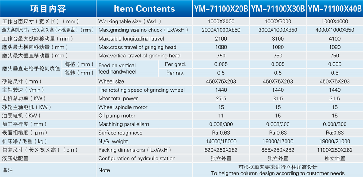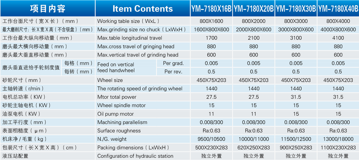 工作台纵向运动为液压驱动。磨头在拖板上的横向运动为滚珠丝杆驱动,亦可手动,并有自动互锁装置。拖板(连同磨头)安装在立杆矩形导轨上,上、下垂直运动具有手动进给和机动(快速升降)功能,并有互锁装置,并配置平衡重锤。升降丝杆为滚珠丝杆,操纵灵活。