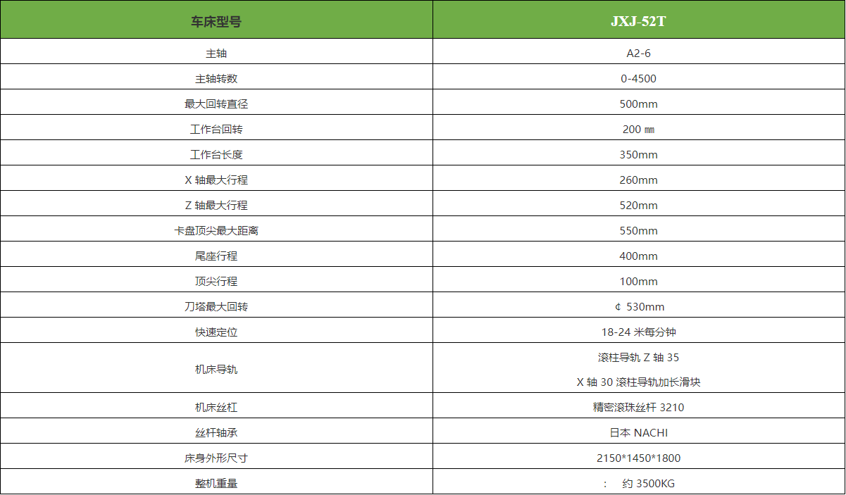 JXJ-52T 系列数控车床采用 35°斜床身设计,整体铸造,主轴轴承采 用进口P4 级轴承,具有高转速、高精度、低噪音的优点,X 、Z 轴双线轨 设计,运行平稳,精度持久,加工效率高。后置分体式排水设计,可加装 后排屑机或右排屑机,可实现无人化自动生产。
