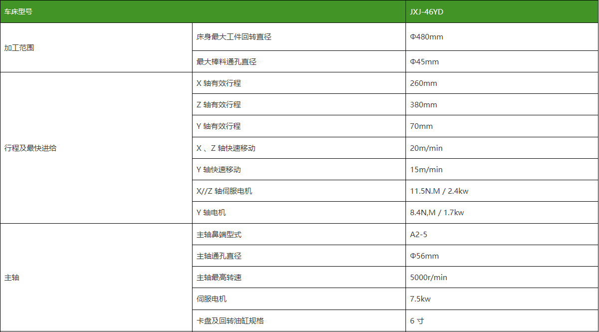 JXJ-46YD 系列数控车床采用 35°斜床身设计,整体铸造,主轴轴承采 用进口P4 级轴承,具有高转速、高精度、低噪音的优点,X 、Z 轴双线轨 设计,运行平稳,精度持久,加工效率高。后置分体式排水设计,可加装 后排屑机或右排屑机,可实现无人化自动生产。